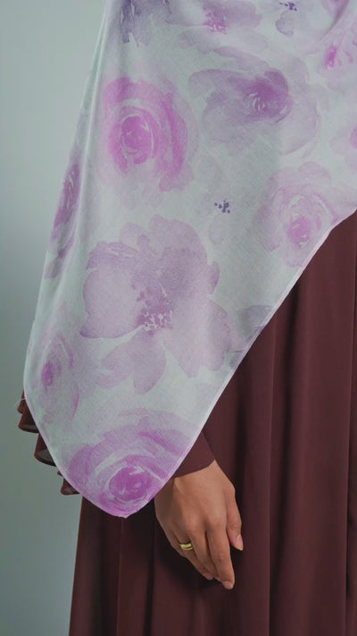 Wisteria is a delicate blend of softness and depth — inspired by cascading florals and muted lavender tones that feel calm, graceful, and quietly striking against a pure white background. Our modal hijabs are the most perfect hijabs for everyday use - they are extremely breathable and versatile! The material is buttery soft - making them one of our favourites in our entire collection of hijabs! We only recommend using our magnets to secure these in place of pins - the material is soft and delicate!